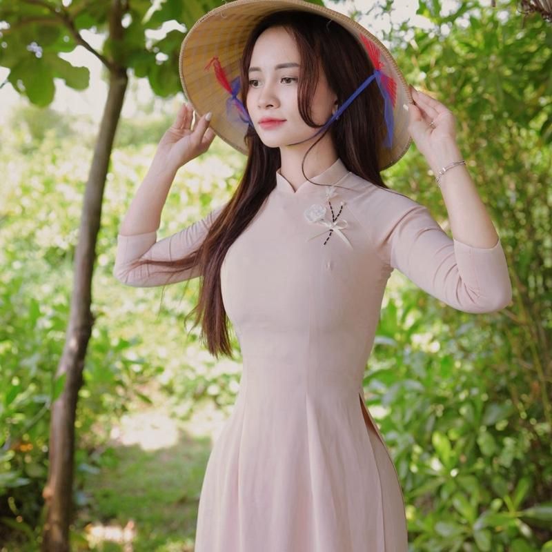 Áo dài Da Kem Cổ Truyền Thống đính hoa thủ công