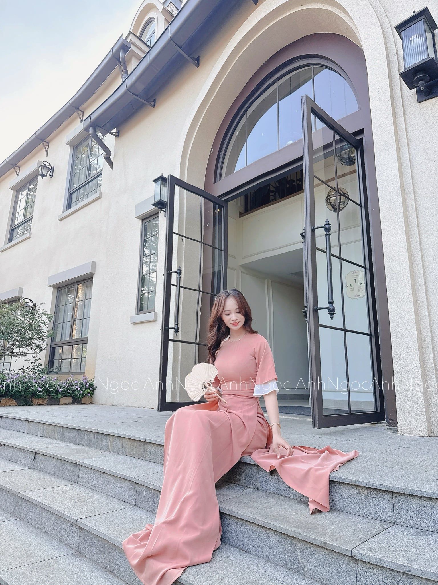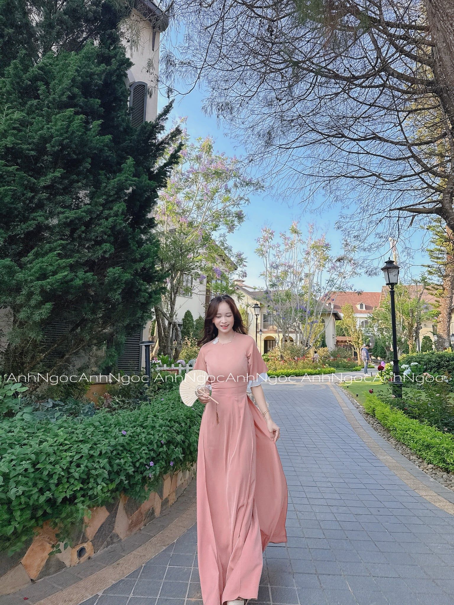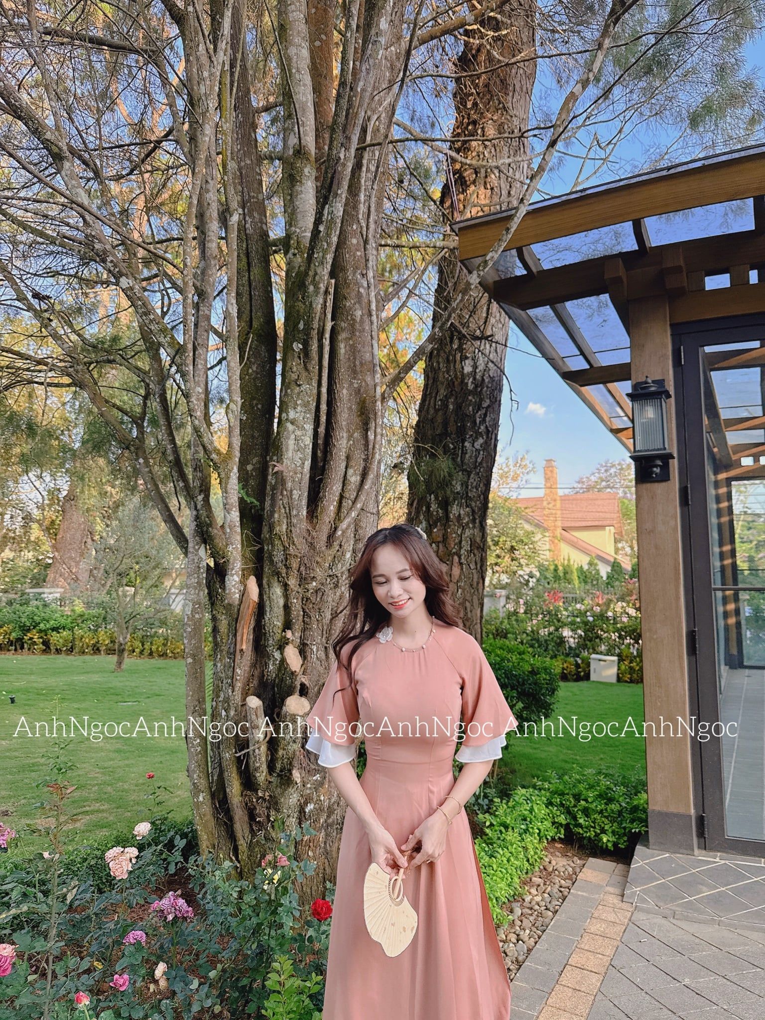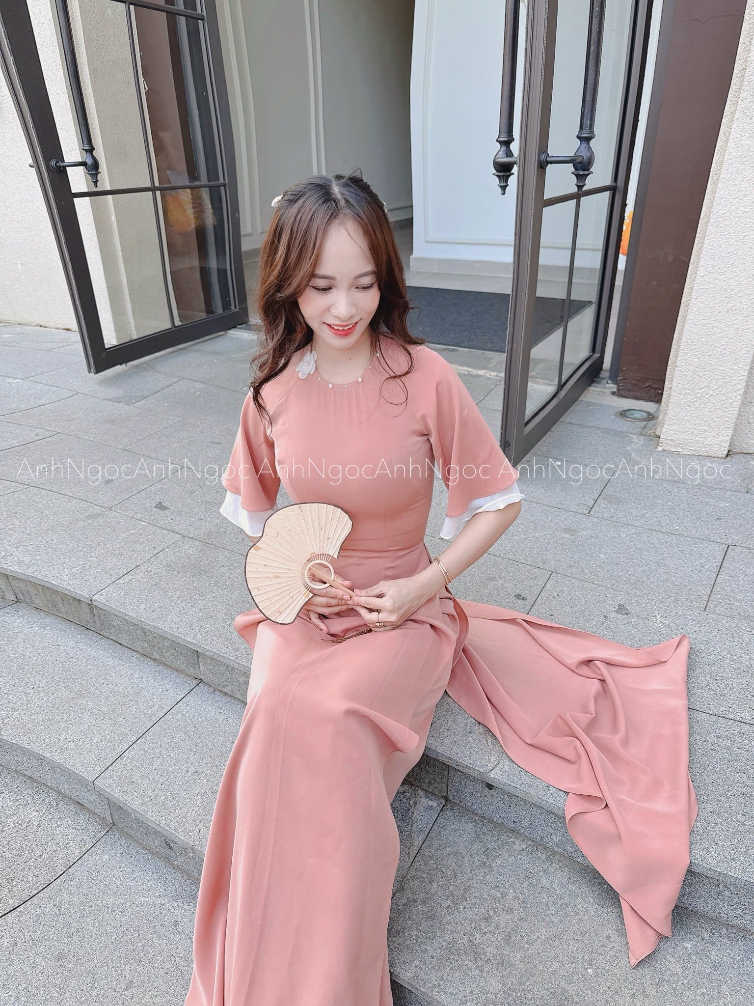 Áo dài Nâu Hồng Tay Loe đính ngọc xinh xắn